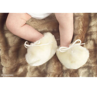 (minimink) milk booties These new bootees are part of the newborn milk range and have faux fur on the outside of the bootee and 100% cotton on the inside. The milk bootees will fit an average baby to 3 months. The inside measurement from toe to heel is 10.5 cm. |